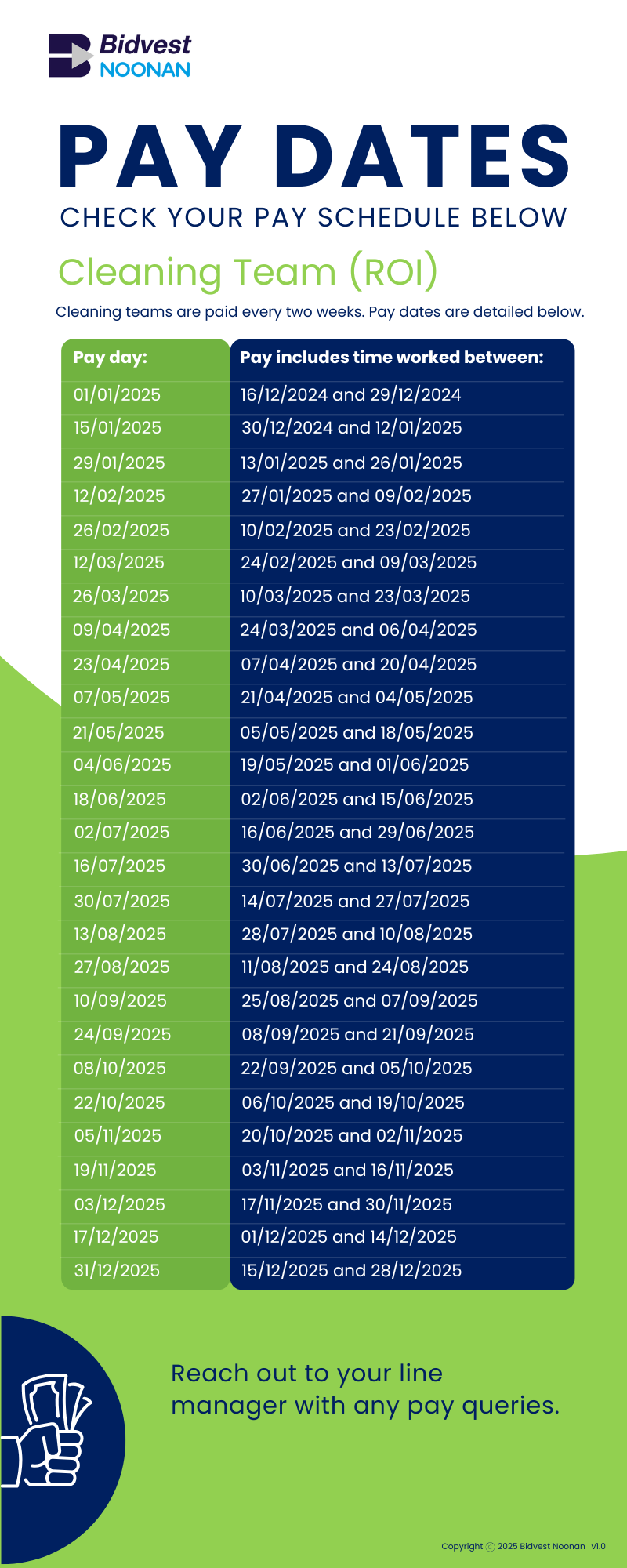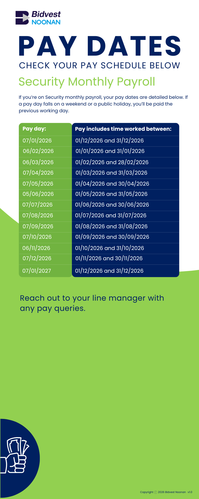 Under TUPE regulations, your existing terms and conditions will transfer with you to Bidvest Noonan. We’ll work with your employer to gather this information, and go through it with you during consultation meetings to make sure everything is accurate and clear.