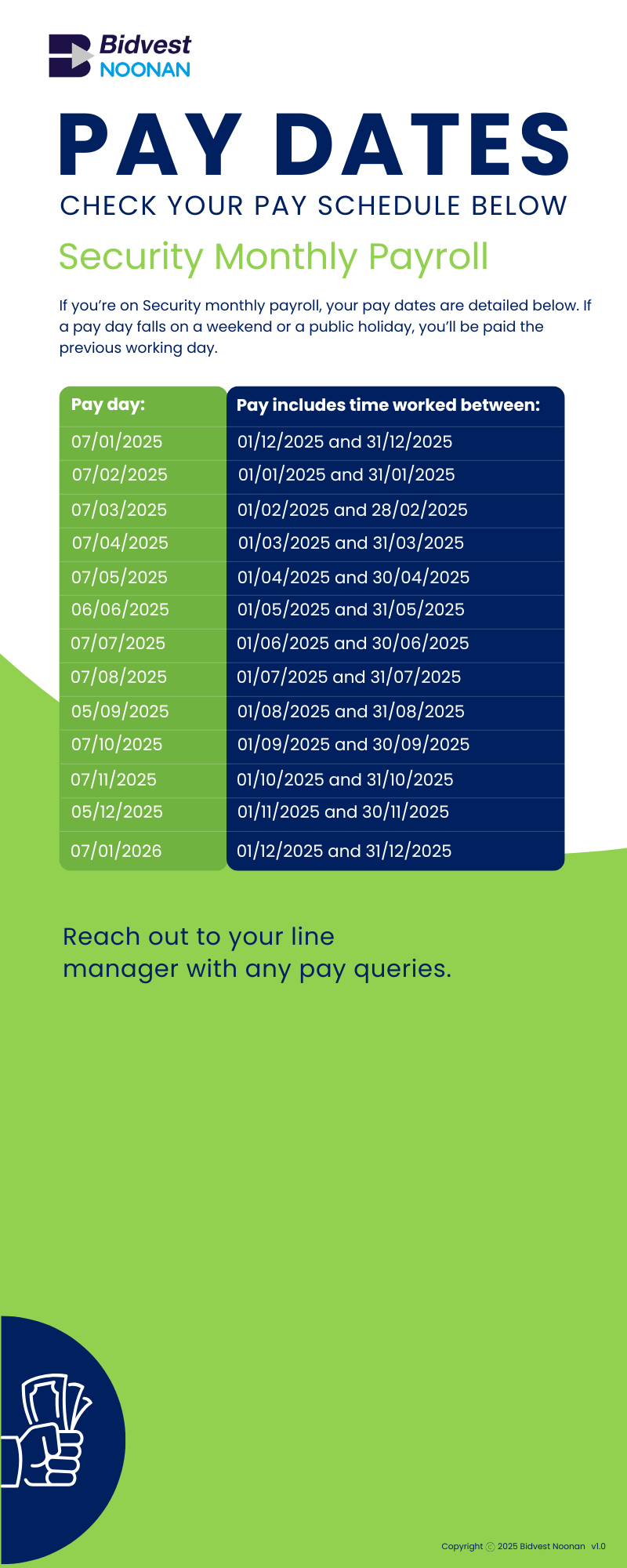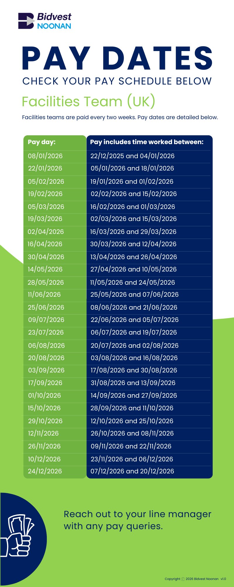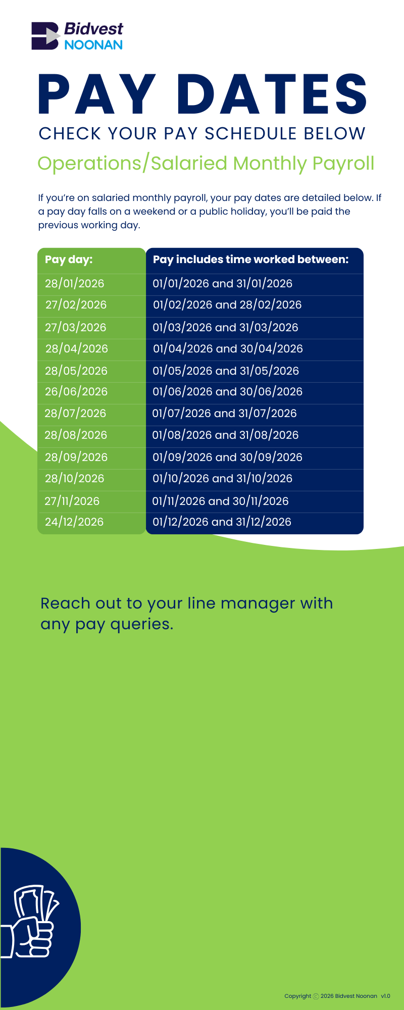We have a number of different pay schedules depending on your role. Please reach out to your line manager with any queries relating to the pay schedule you’re on.